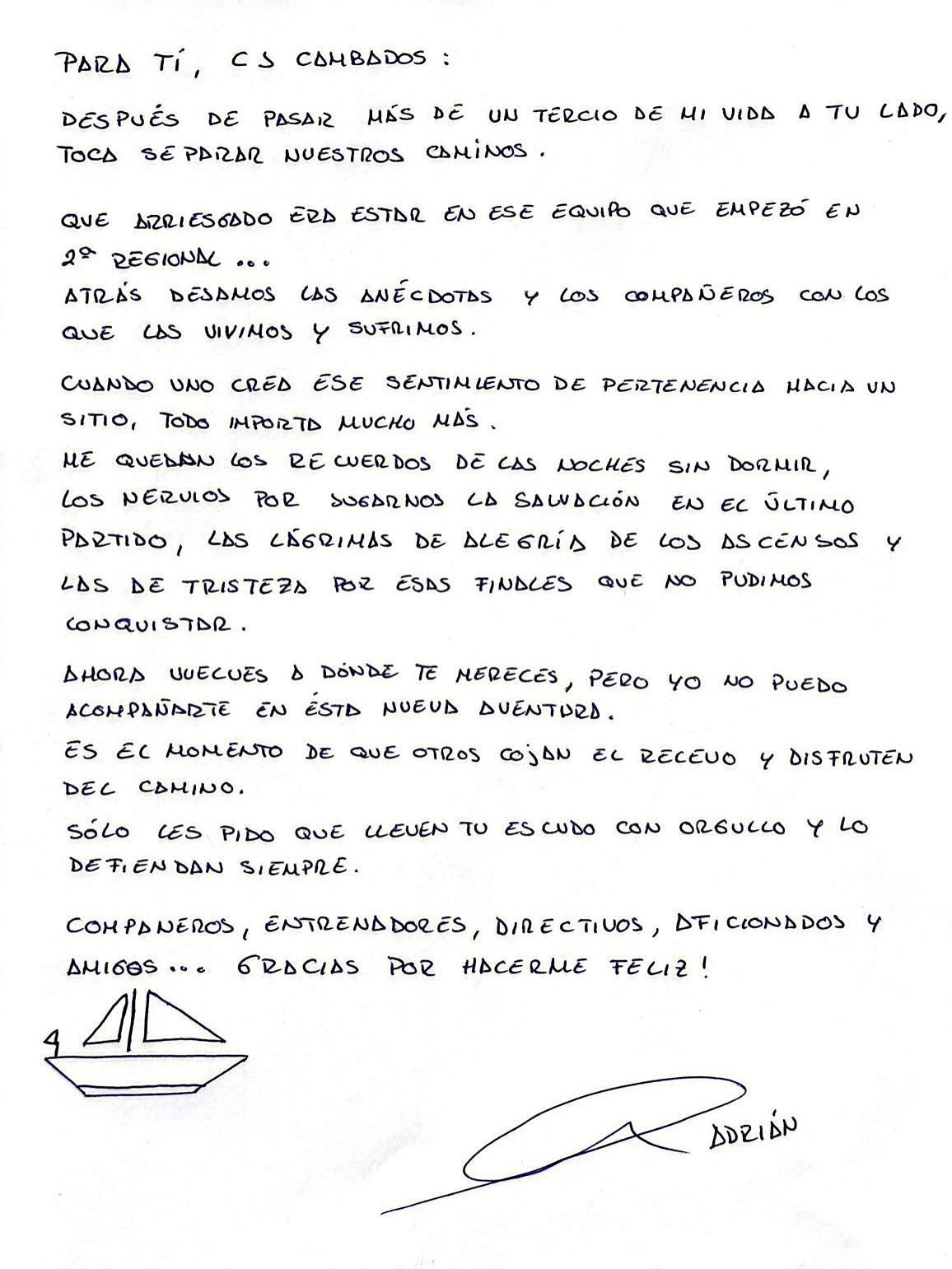 Jul152025 Adrian causa baixa na nosa plantilla. Queremos agradecer o gardameta o seu compromiso todos estes anos. Adri comenzou no noso club en Segunda Autonómica e deixa o equipo en terceira RFEF. Moitísimas gracias por todo, esta sempre será a túa casa. Categoría: SENIOR MASCULINOjulio 15, 2025 Comparte Share on FacebookShare on Facebook Share on XShare on X TweetShare on Pinterest Share on LinkedInShare on LinkedIn Share on WhatsAppShare on WhatsApp Navegación entre publicacionesAnteriorPublicación anterior:PROMOCIONA DE LA CANTERA JOELSiguientePublicación siguiente:FICHAJE RODRIGO VÁZQUEZNOTICIAS RELACIONADAS7ª Jornada 3ª RFEF – CJ Cambados – Celtiga FCoctubre 14, 2025CJ Cambados 2 – Viveiro CF 0octubre 12, 20256ª Jornada 3ª RFEF – CJ Cambados – Viveiro CFoctubre 8, 2025CD Boiro 1 – CJ Cambados 1octubre 5, 2025